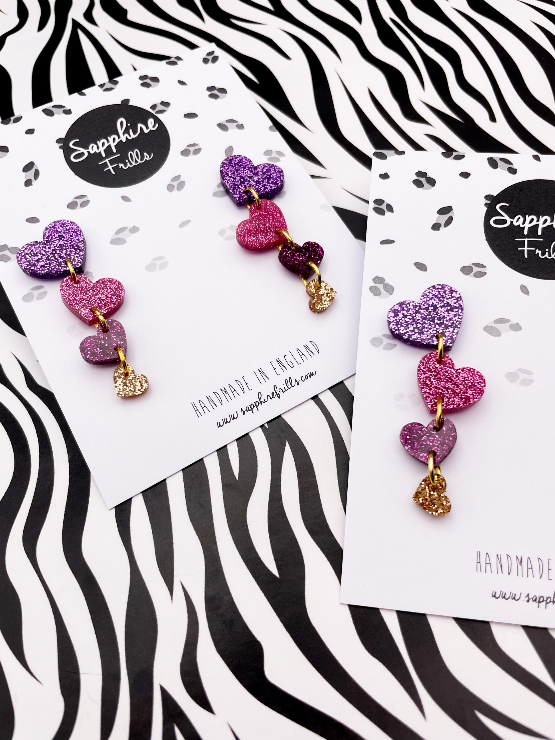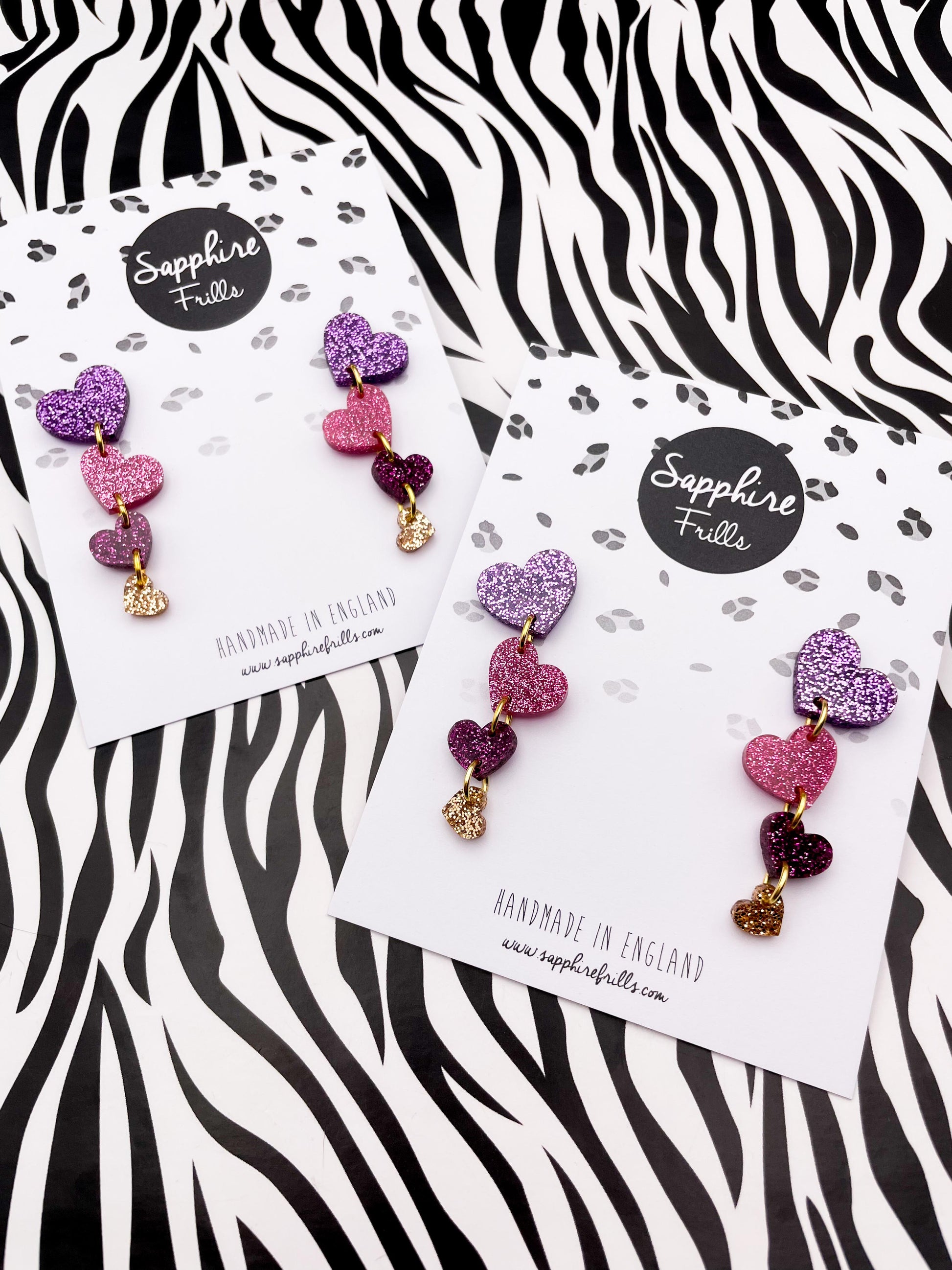 Colours: mauve purple glitter, hot pink glitter, dark purple glitter and champagne gold glitter acrylic hearts.